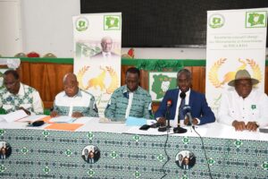 Réuni en point de presse à son siège de Cocody, sous la convocation du député Doho Simon, président du Groupe parlementaire et vice-président du parti, le PDCI-RDA a donné une réponse claire à la crise politique qui s’installe. Prenant la parole, le vice-président Akossi Bendjo a martelé : « Nous participerons à cette élection avec notre seul et unique candidat, Tidjane Thiam. »